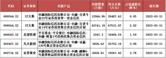与此同时,中融信托旗下产品也持有多家上市公司股权。截至2023年一季报,ST大集、北部湾港、尤夫股份、金贵银业等4 家A股上市公司均是中融信托产品的重仓股,最高持股比例达到3.88%。